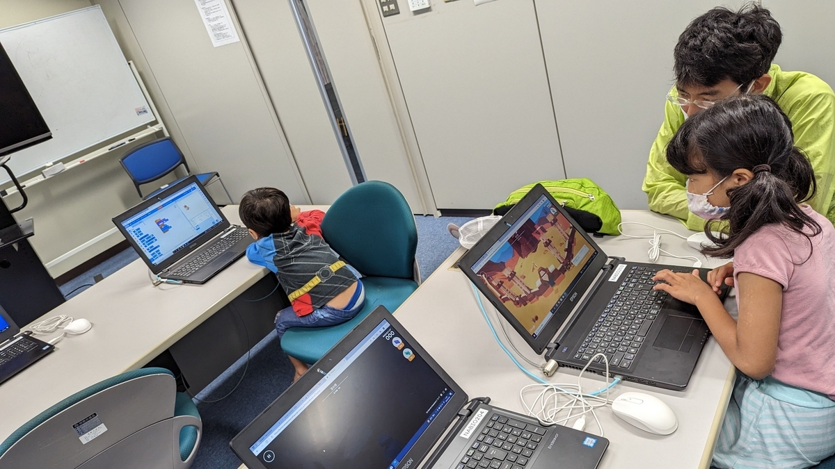 初参加の姉弟でした。 スクラッチの存在を耳にしたけどどういうものかまったくわからないとの事でした。 初歩的な事を一通り紹介したあとは楽しそうにプログラミングしていたのが印象的でした。